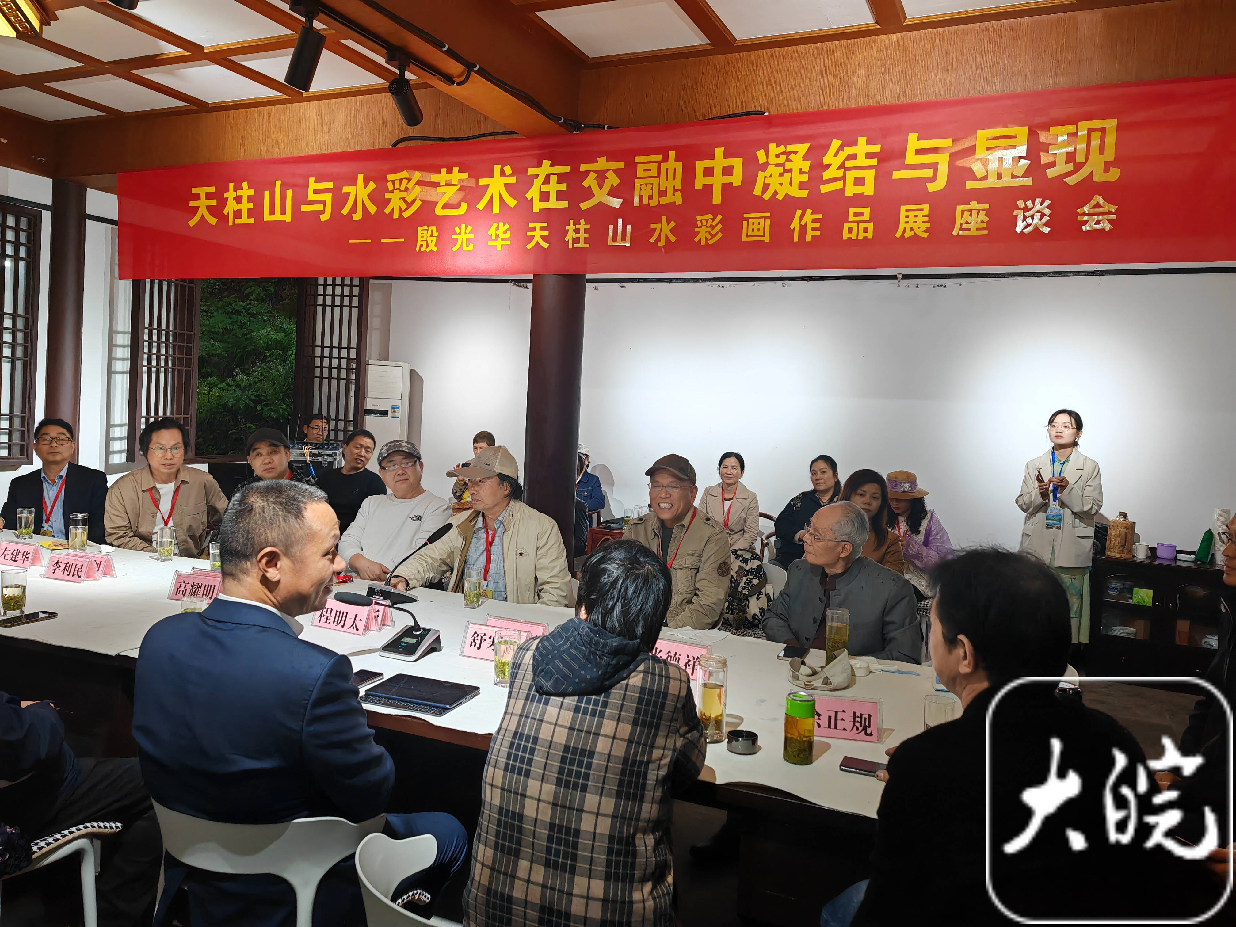 開幕式上,天柱山管委會(huì)為殷光華頒發(fā)“天柱山駐山畫家”和“天柱山榮譽(yù)山民”證書,并舉行殷光華天柱山繪畫工作室揭牌儀式。殷光華向天柱山管委會(huì)和地質(zhì)公園博物館分別贈(zèng)送一件作品,并獲贈(zèng)收藏證書。4日下午,就“天柱山與水彩藝術(shù)在交融中凝結(jié)與顯現(xiàn)”舉行座談。