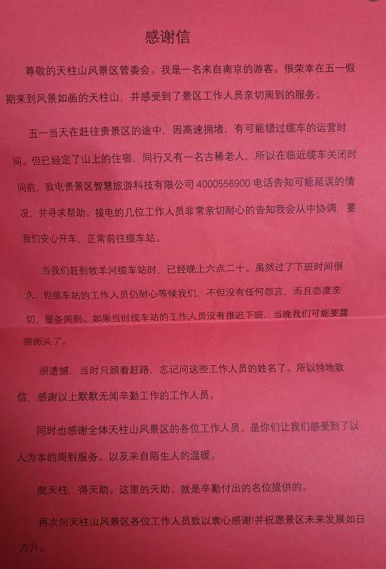 “感謝天柱山風(fēng)景區(qū)默默無聞辛勤工作的工作人員,是你們讓我們感受到了以人為本的周到服務(wù),以及來自陌生人的溫暖,祝愿景區(qū)未來發(fā)展如日方升……”5月8日下午,天柱山景區(qū)收到了一封來自南京游客的感謝信。紙短情長,字字暖心,流露出對天柱山工作人員的充分認可和信賴,深切地表達了對天柱山景區(qū)的感激之情。